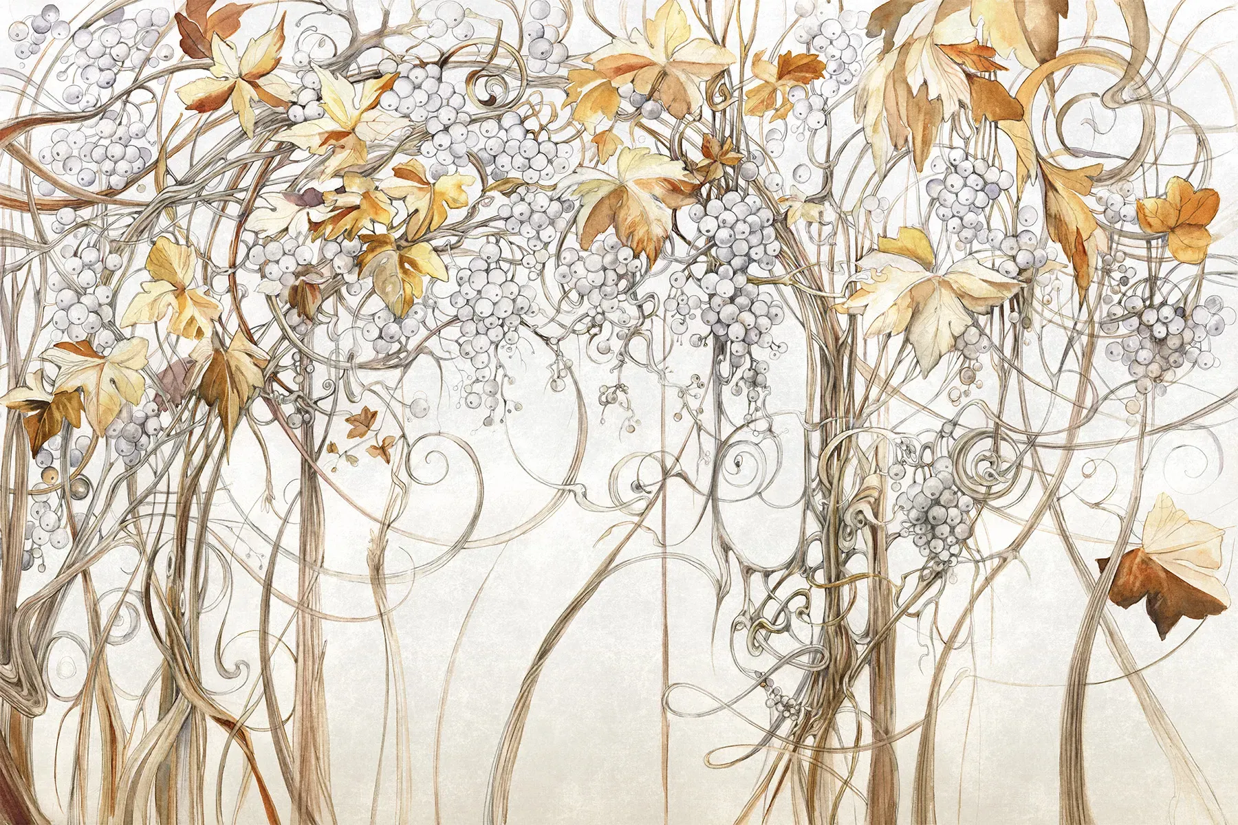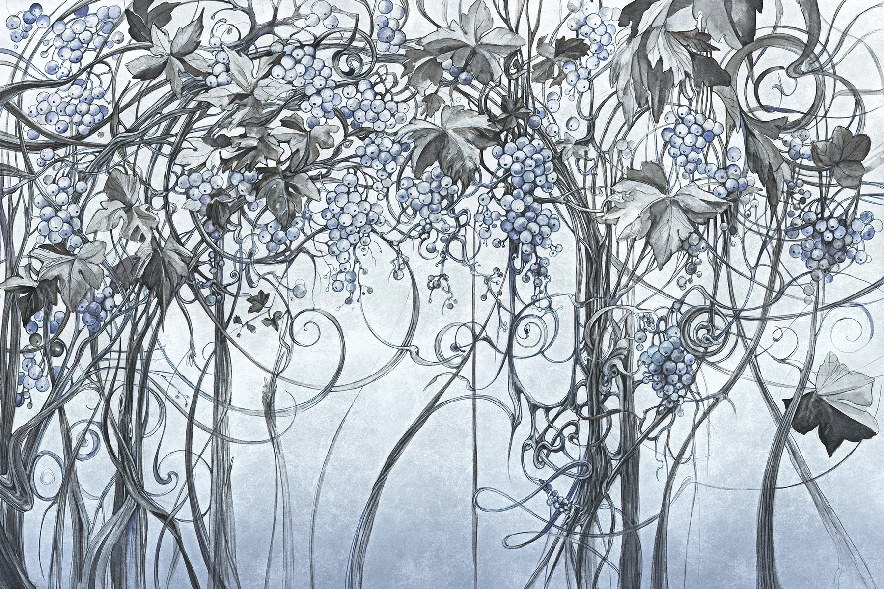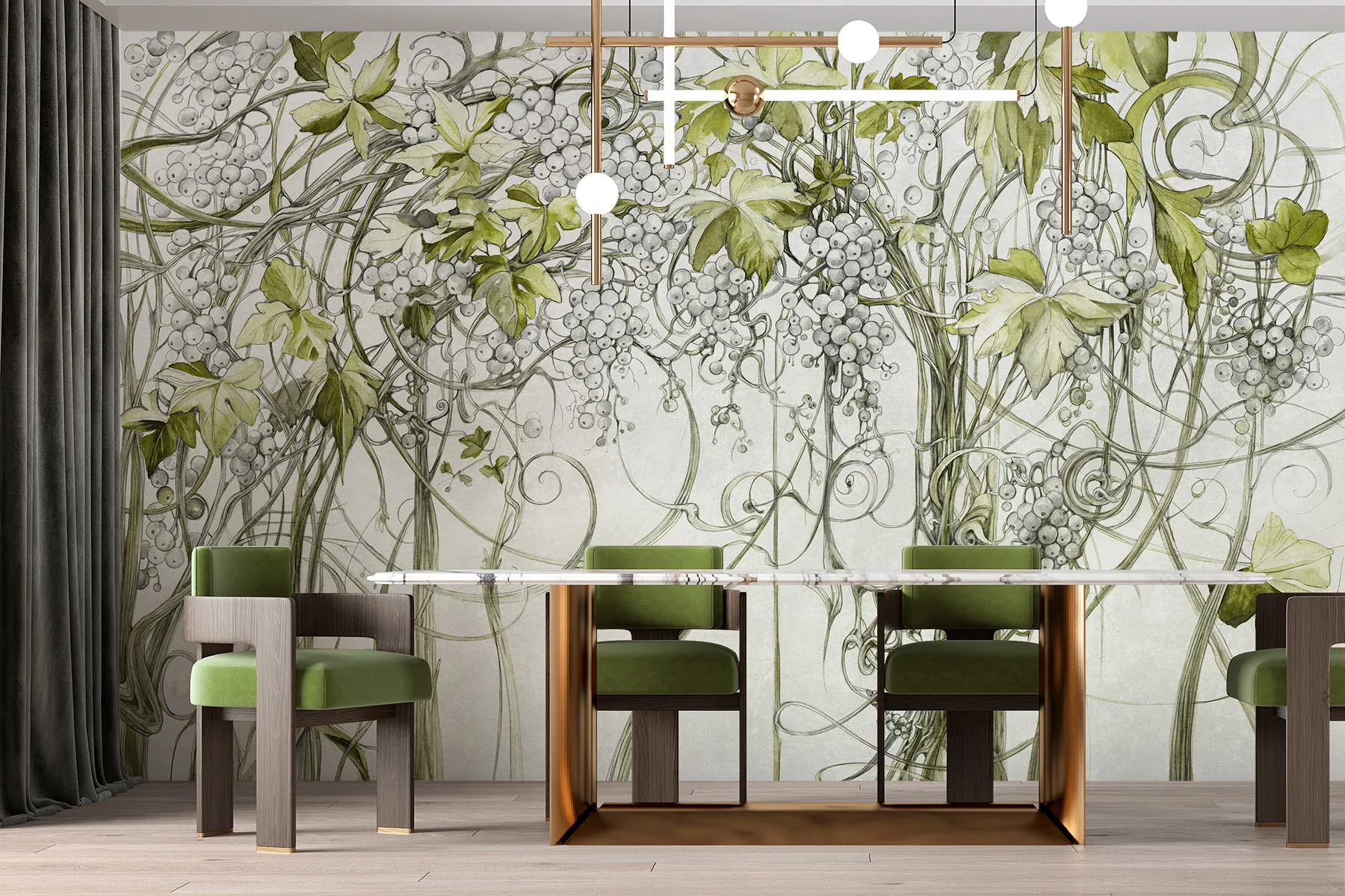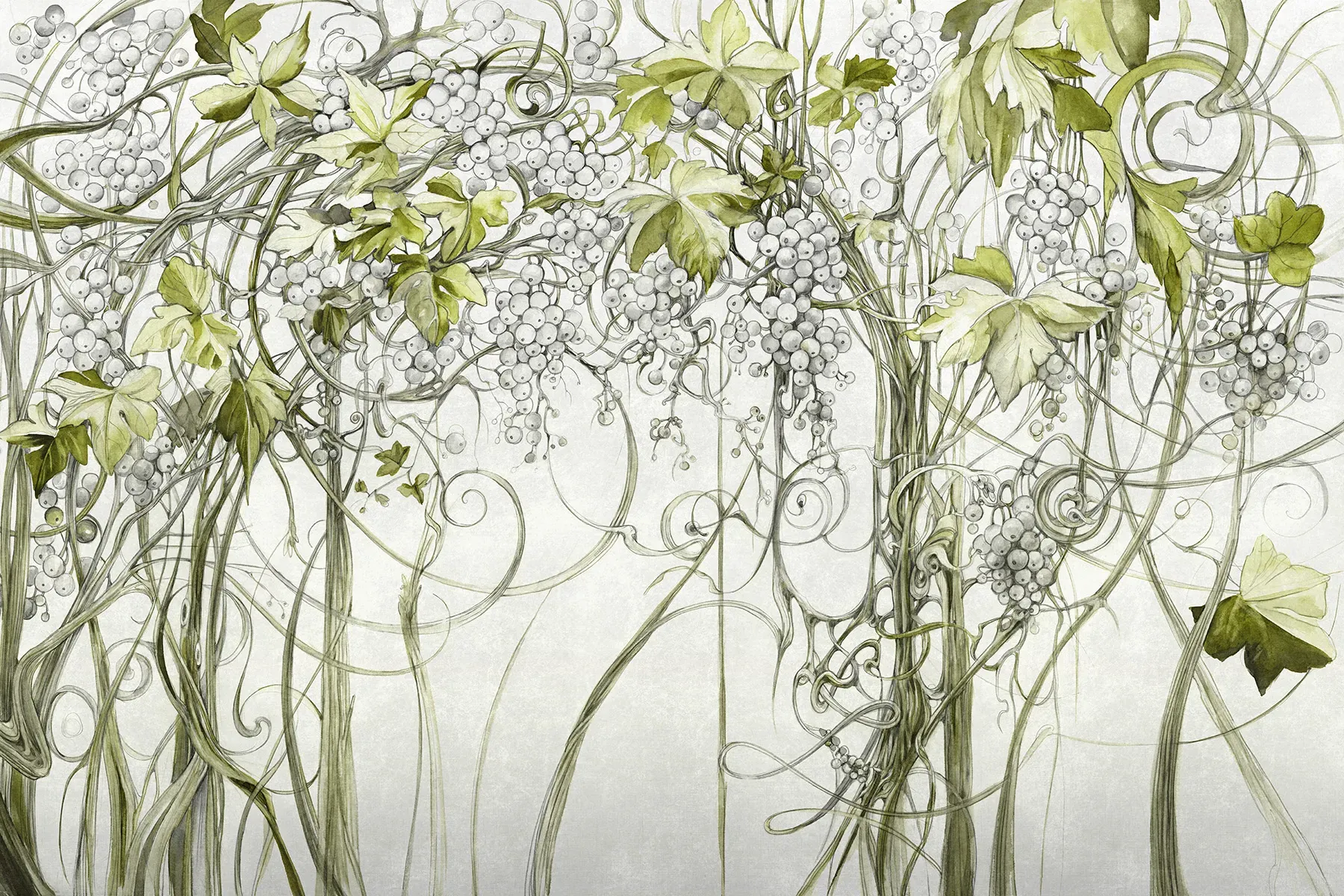 Las hojas y las uvas, que simbolizan la abundancia y la vida, crean una composici贸n llena de frescura y armon铆a. Sus contornos expresivos y los delicados tonos de verde, beige y azul le dan al interior una agradable atm贸sfera de paz y relajaci贸n. El dise帽o pintado a mano le da al fotomural un car谩cter individual, haciendo que cada detalle sea 煤nico.