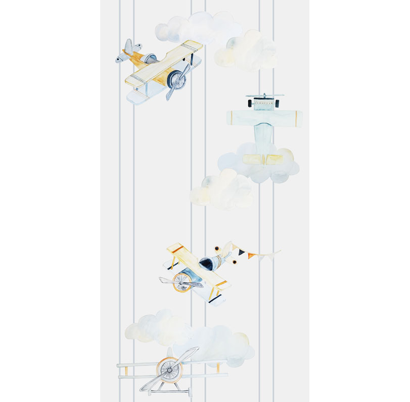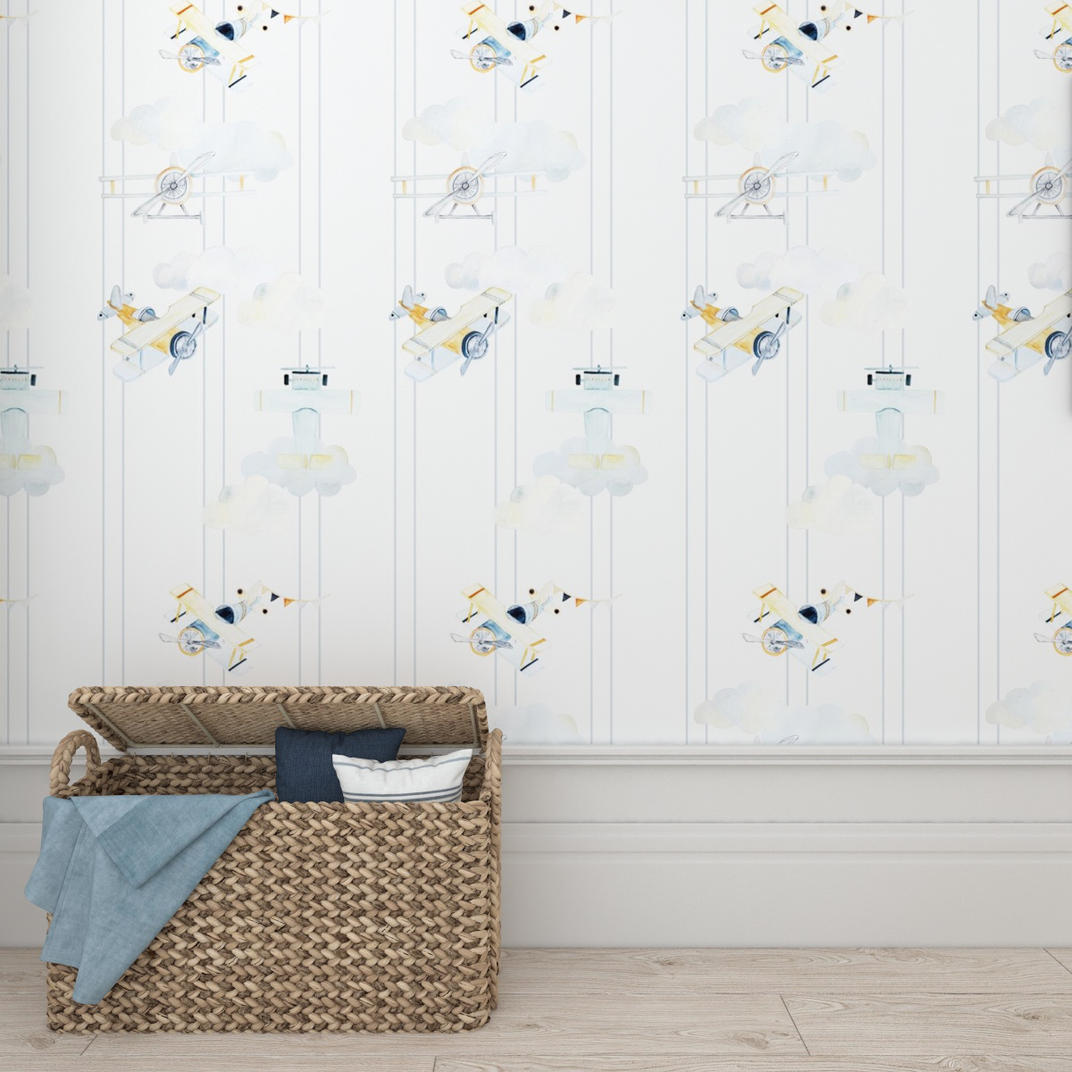 Es un papel pintado con aviones y rayas. Es ideal para la habitación de un niño.