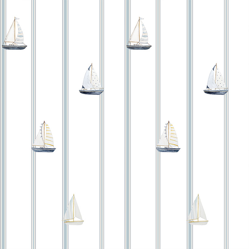 Papel pintado con delicadas rayas azul claro y un motivo de veleros. Es un clásico atemporal de estilo marinero que encaja tanto en la habitación de un niño como en interiores para adultos, como el salón, el dormitorio o el baño. El papel pintado tiene motivos en azul claro, beis y amarillo.