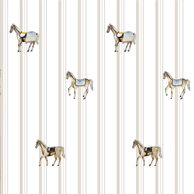 Papel pintado a rayas con caballos sobre un fondo blanco y con rayas adicionales en color beis. El papel pintado ideal para los aficionados a la equitación. Es un clásico atemporal que encaja tanto en la habitación de un niño como en el salón o el dormitorio.