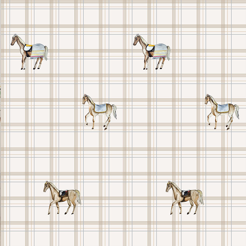 Este papel pintado es una verdadera obra de arte, con caballos pintados a mano sobre un delicado fondo de cuadros en tonos beige y azul claro. Es un diseño único que combina el encanto del mundo natural con una paleta de colores serena. Este papel pintado creará una atmósfera mágica en la habitación del niño, donde los pintorescos caballos añadirán encanto y los colores aportarán tranquilidad y armonía.
