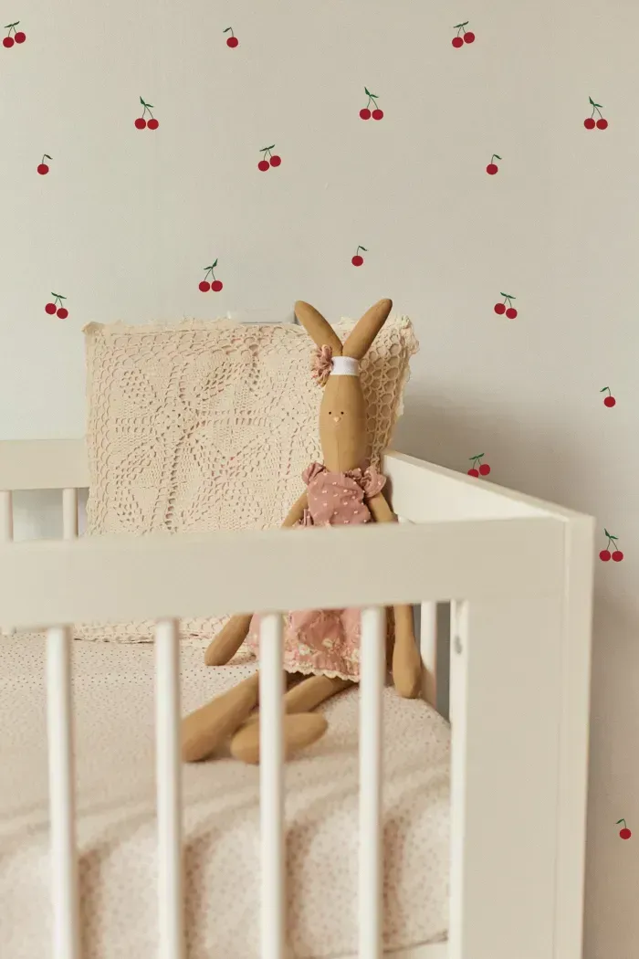 El motivo de las cerezas es agradable y placentero a la vista. Realmente se asocia con la naturaleza, pero también con la dulzura. Este papel pintado crea en la habitación del niño una atmósfera tranquila y llena de optimismo, y al mismo tiempo, por la noche, permite relajarse y facilita conciliar el sueño. El niño puede sentirse como en una tierra idílica. El papel pintado con cerezas refleja perfectamente la belleza de la naturaleza. Por lo tanto, quedará genial en una habitación no solo de estilo vintage, sino también boho o clásico. Por supuesto, también vale la pena saber que la habitación se puede personalizar aún más, por ejemplo, colocando una lámina de nacimiento sobre el fondo del papel pintado. El color de las cerezas rojas y jugosas sobre un fondo blanco claro es muy sutil y combina con muchos muebles diferentes, tanto en color blanco como marrón, e incluso con aquellos en tonos pastel. Este papel pintado hace que la habitación sea aún más acogedora.