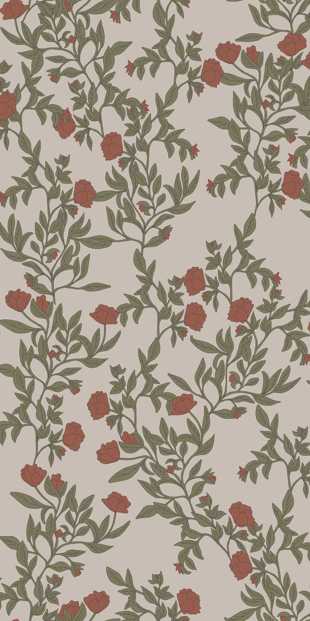 Papel pintado eustoma burdeos, verde y beige – en rollo