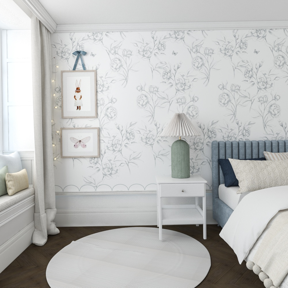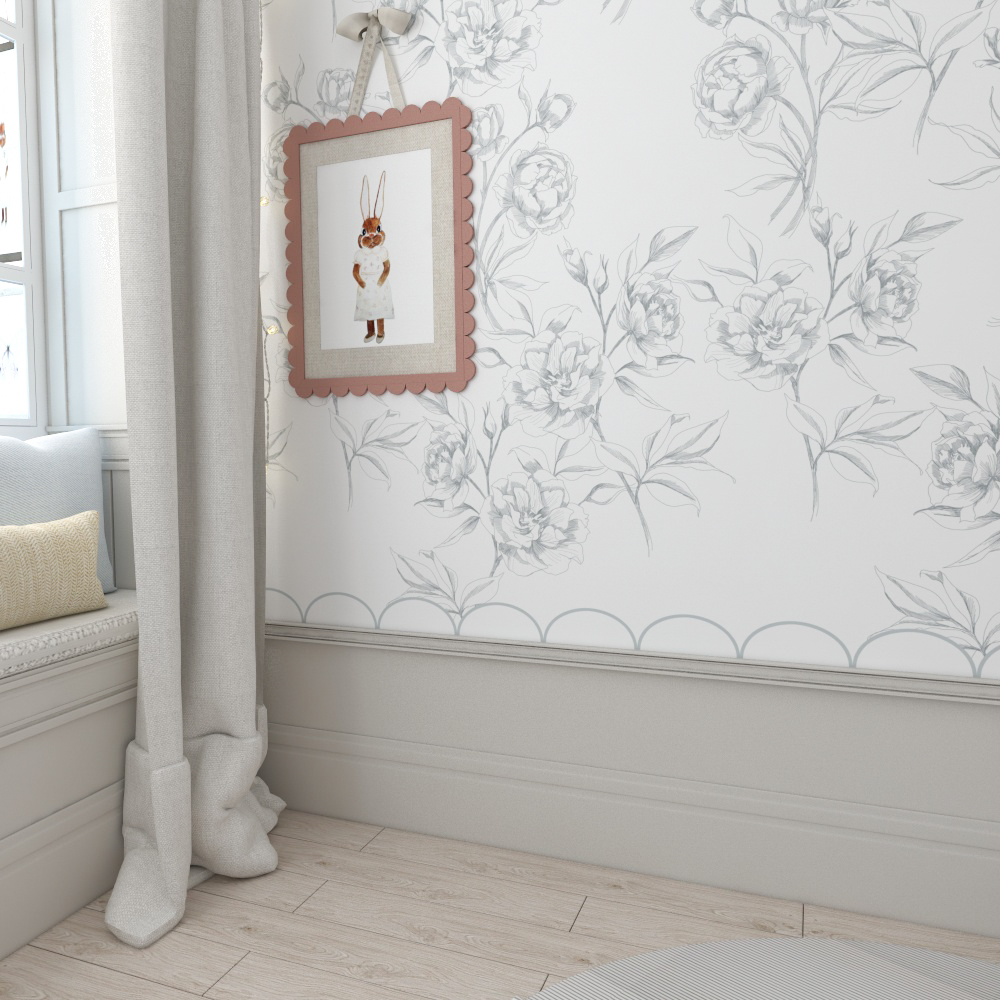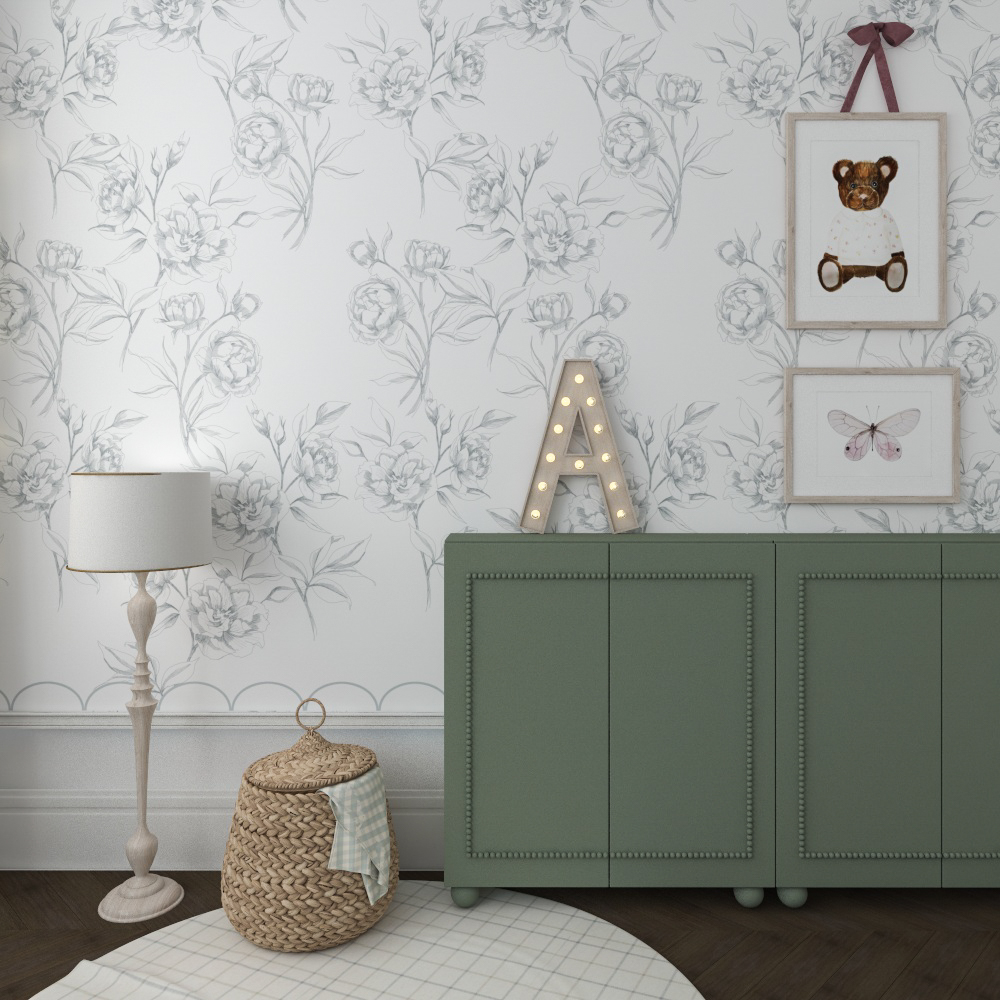 - Volante azul claro: En la parte inferior del papel pintado hay un sutil volante azul claro que resalta y cierra el diseño, añadiéndole un encanto único.