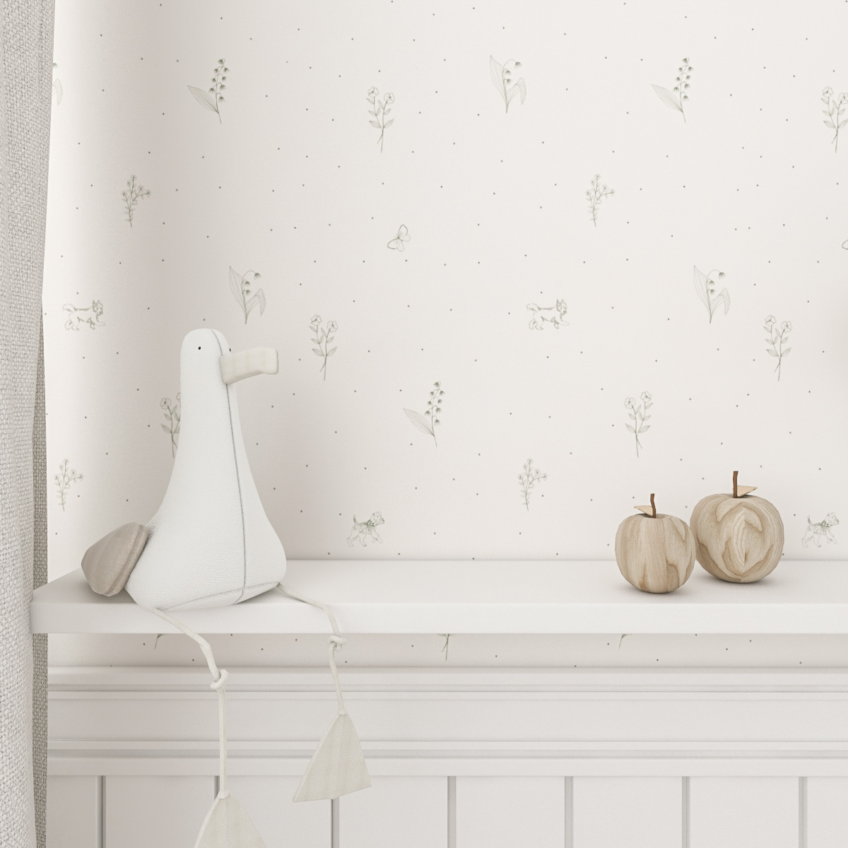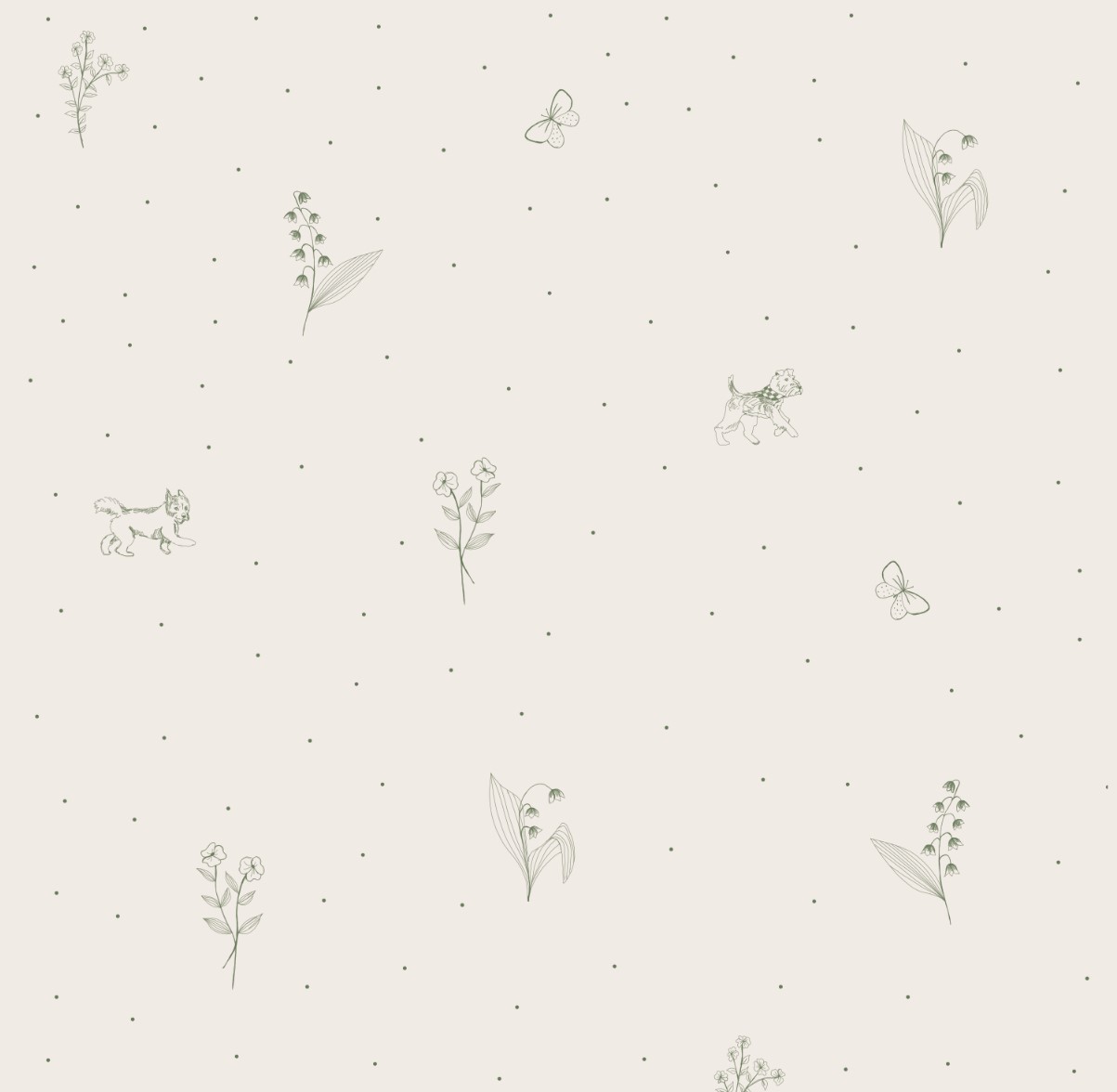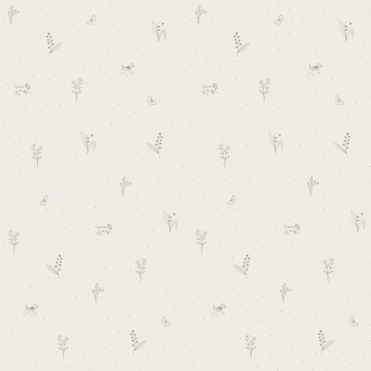 El diseño de ramitas y perritos se repite en nuestros papeles pintados cada 100 cm. La disposición libre de los motivos decorativos hace que las repeticiones sean prácticamente imperceptibles, y el diseño no domina la habitación, sino que es un sutil complemento. Encontrarás el adhesivo de montaje necesario para pegar el papel pintado en el kit, pero recuerda preparar adecuadamente la superficie de la pared primero.