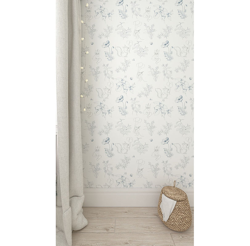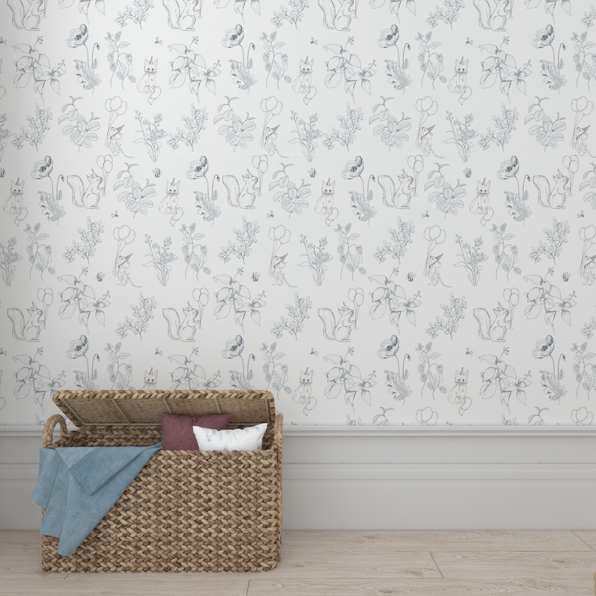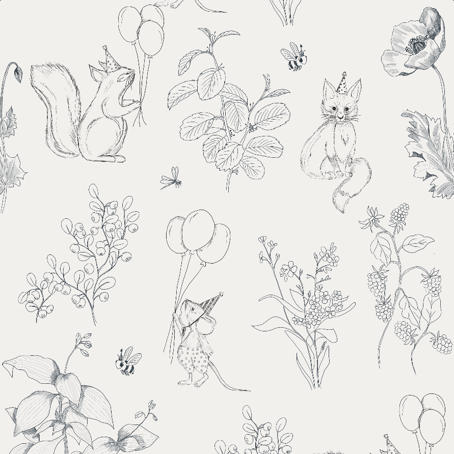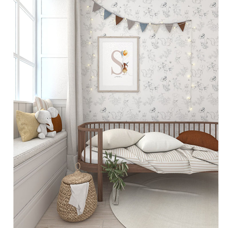 El motivo del bosque funciona de maravilla en la habitación de un niño. Por eso, un papel pintado con un zorrito escondido entre plantas y flores, una ardilla celebrando con globos en sus patitas o un ratoncito con un equipo similar, evoca los mejores cuentos infantiles. Este papel pintado puede ser una fuente para inventar vuestras propias historias de cuento de hadas junto con el niño, lo que puede ser un juego creativo, por ejemplo, antes de dormir. En el papel pintado también se ven abejitas e incluso una libélula volando. El detalle y la multitud de personajes hacen que un niño pequeño no se aburra al mirar esta pared. Y la escena le recordará que jugar sin preocupaciones es lo más importante. Sin duda, el papel pintado es una inspiración para ello.
