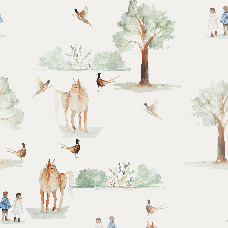 No es una simple decoración, es un fragmento de una historia que cobra vida en la pared. El diseño, estilizado como un antiguo grabado coloreado, recuerda a una página de un querido libro de la infancia. Cada detalle tiene su importancia: majestuosos caballos en diferentes poses, figuras de niños paseando entre helechos e incluso faisanes escondidos en la espesura del bosque. Beiges apagados, verdes tenues y marrones cálidos y difuminados crean una paleta de colores que calma los sentidos e introduce armonía en el interior. Es un papel pintado pictórico, caballos en la niebla de estilo vintage, que parece contar una historia en un susurro. Su carácter artístico hace que sea algo más que un fondo: es una verdadera obra de arte que encontrarás en nuestra colección de decoraciones para la habitación infantil con animales del bosque.