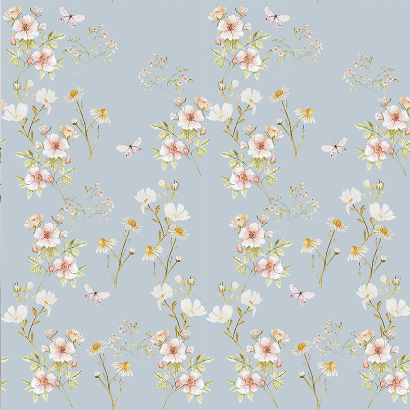 Papel pintado con delicadas flores con un toque de color té sobre un fondo azul celeste. El papel pintado recuerda a un prado primaveral con mariposas. Es un clásico atemporal de estilo idílico y romántico, perfecto para la habitación de una niña.