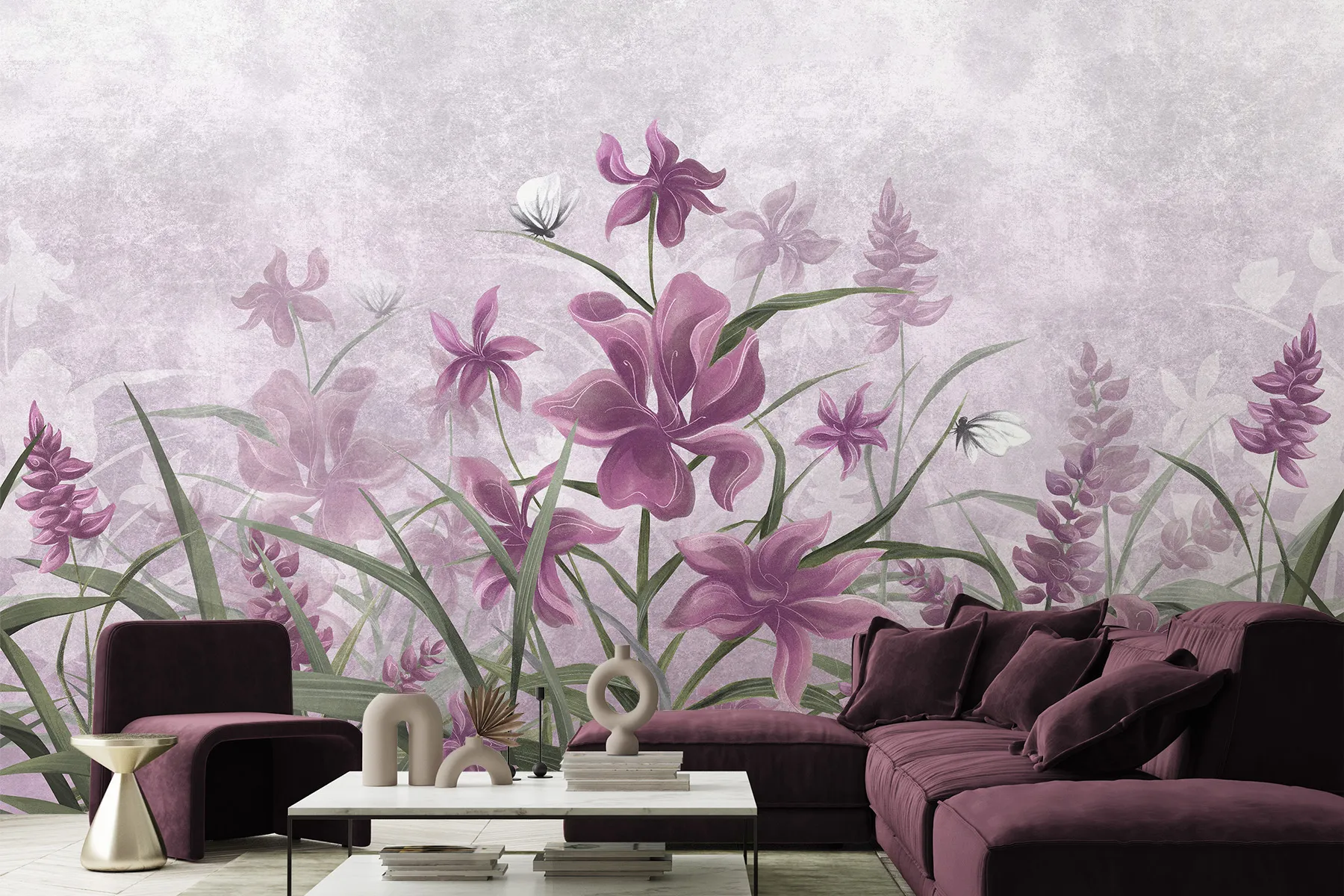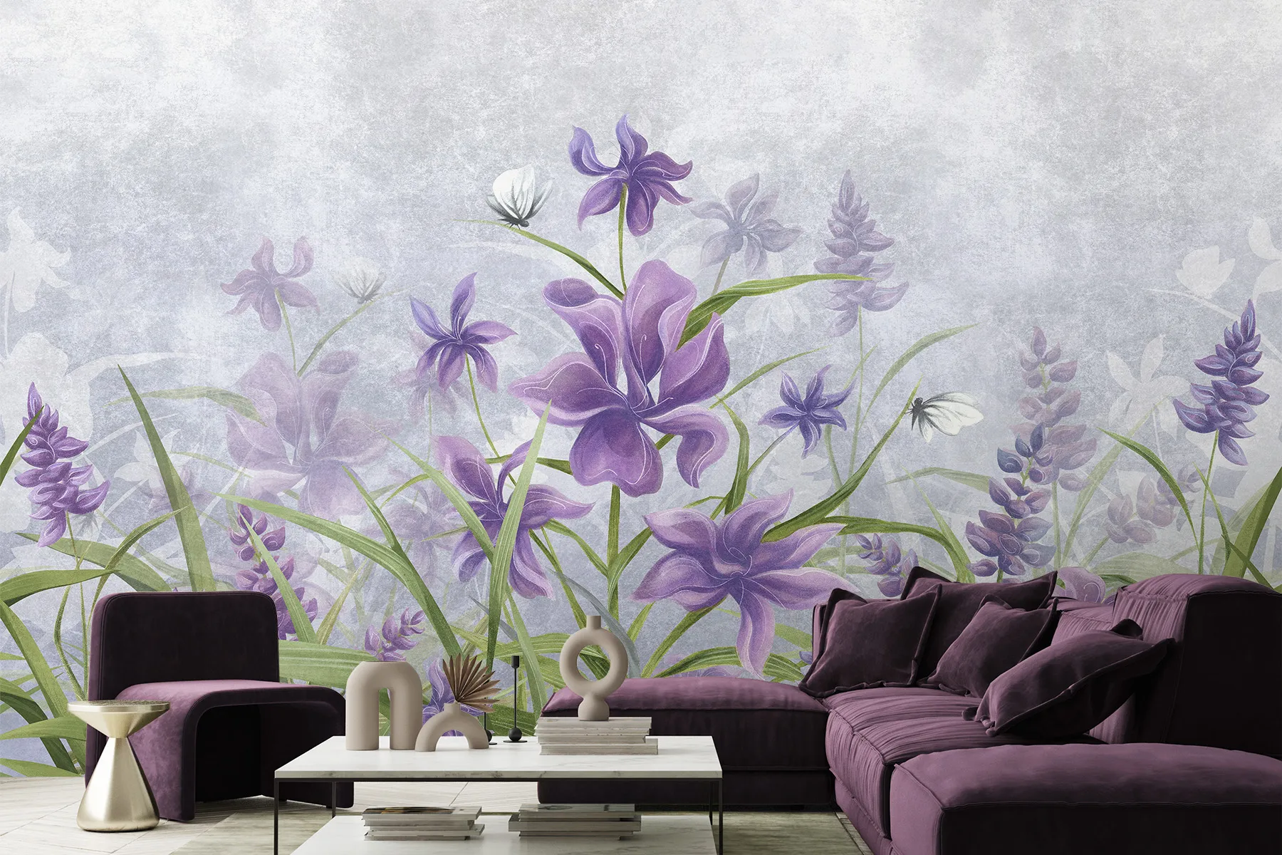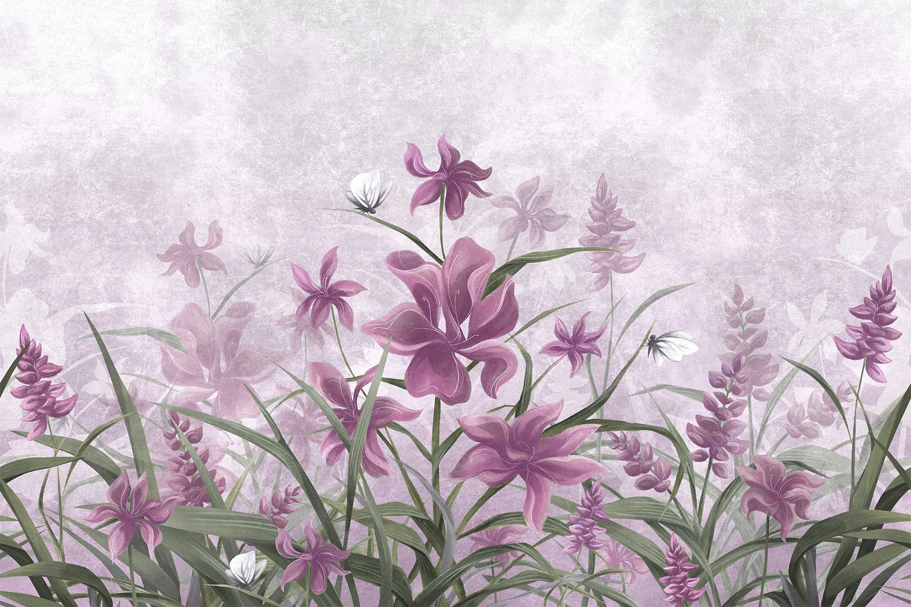Este papel pintado pintado a mano, con un delicado dise帽o de flores de iris moradas, es la quintaesencia de la artesan铆a art铆stica, encajando perfectamente en cualquier espacio femenino. Su dise帽o 煤nico y la riqueza de detalles lo convierten en una decoraci贸n interior ideal, especialmente en la habitaci贸n de una ni帽a, donde introduce una atm贸sfera de ensue帽o y delicadeza.