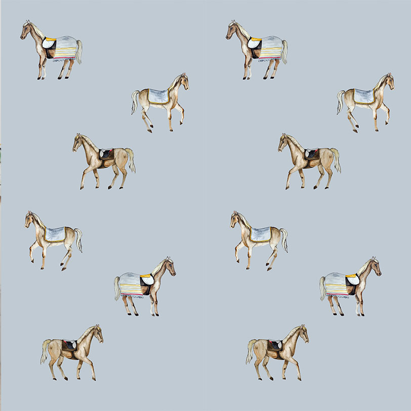 Papel pintado a rayas con caballos sobre un fondo azul claro. Un papel pintado ideal para los aficionados a la equitación. Es un clásico atemporal que encaja en la habitación de un niño, pero también en el salón o el dormitorio.