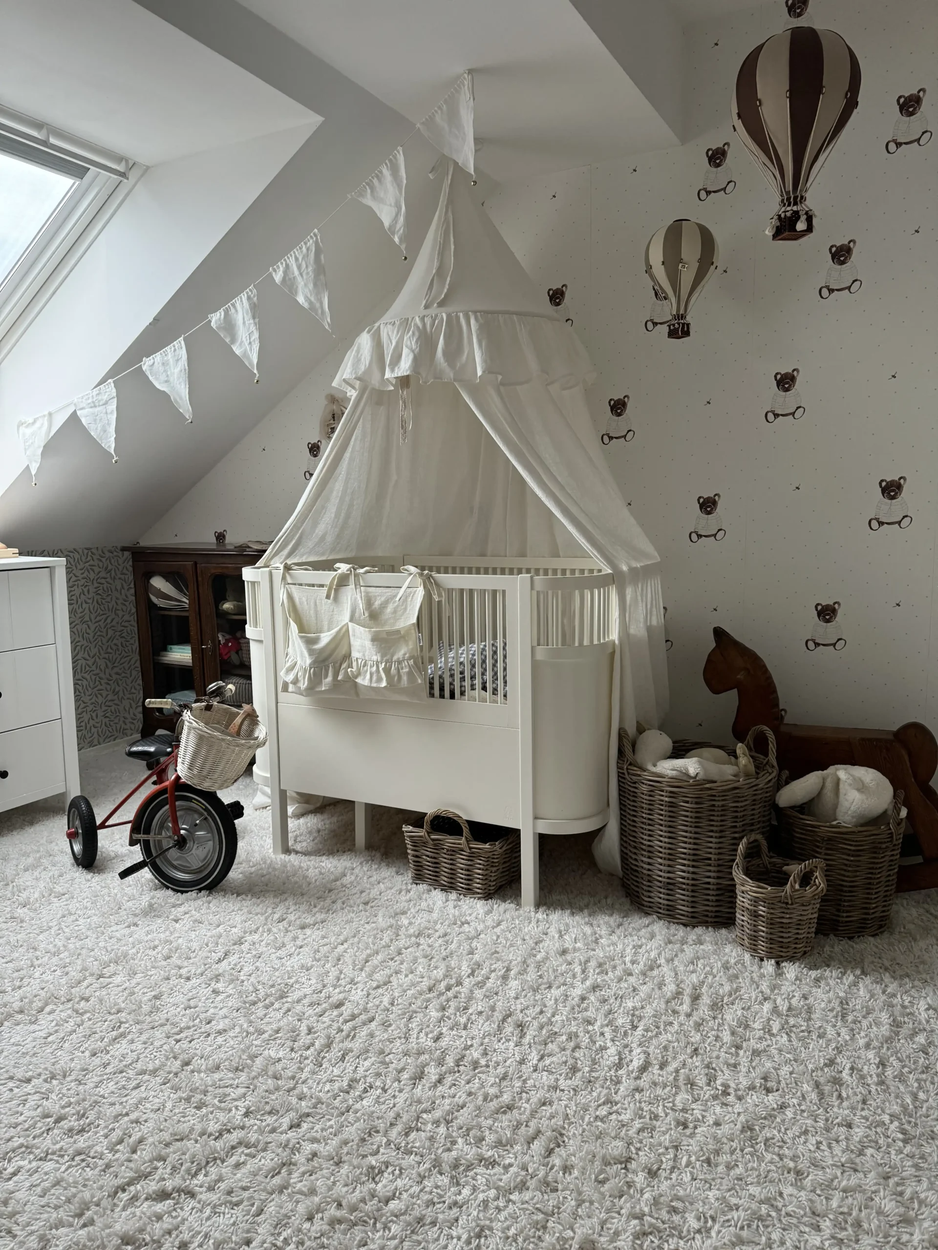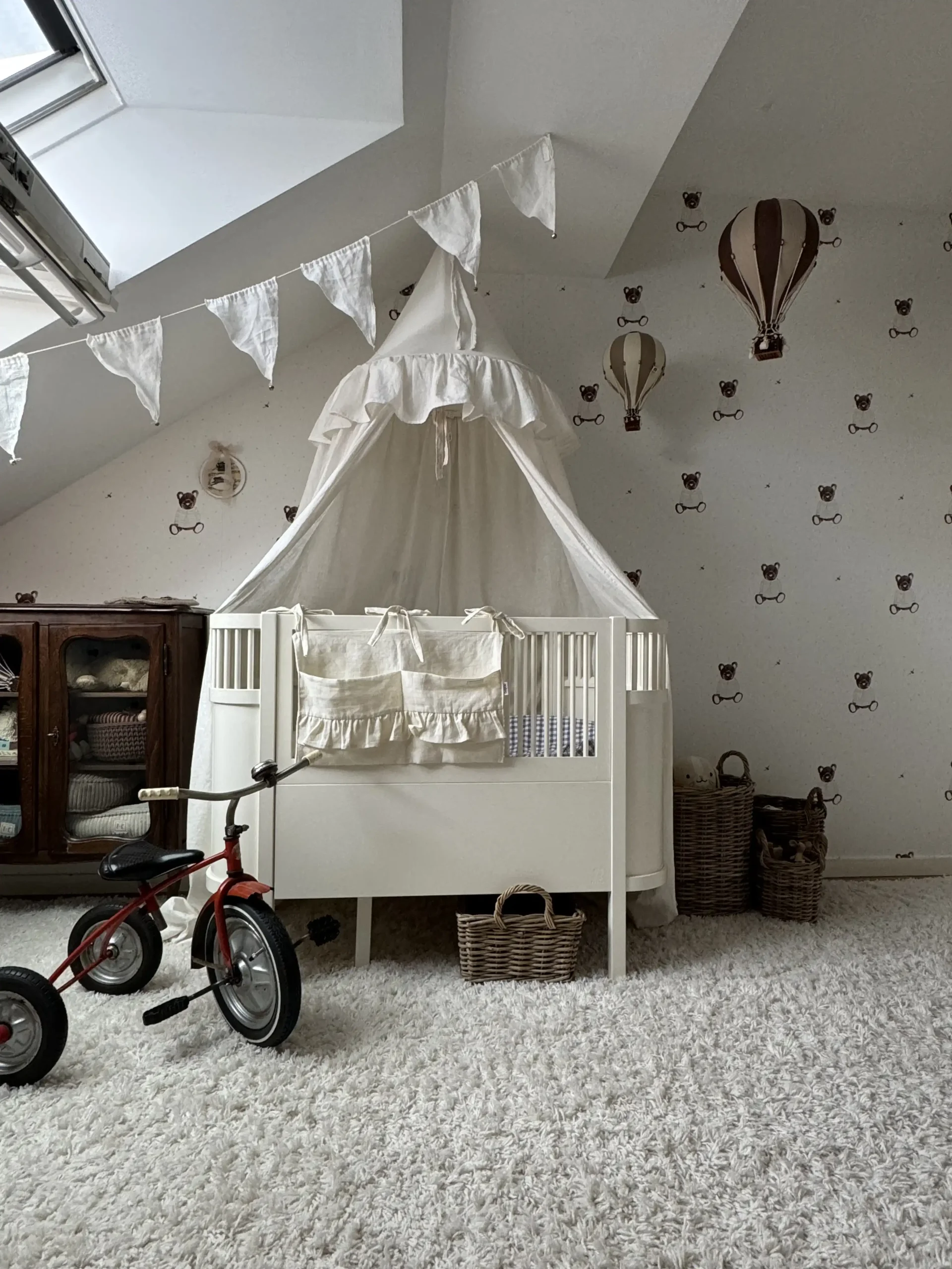 Una paleta de colores relajante y un diseño natural de papel pintado con un osito y abejas: crea el espacio ideal para dormir y jugar creativamente